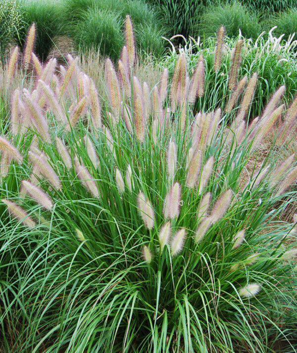 40/60 cm – Feuillage vert sombre en touffe évasée – Épis brun clair