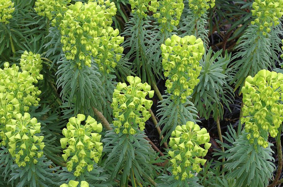 Touffe dressée, persistante – Joli feuillage bleuté – Bractées jaune verdâtre – Hauteur 50 cm