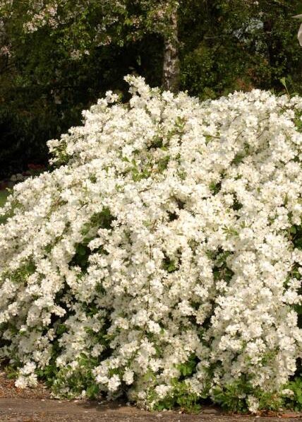 Port évasé, lâche, rameaux retombants – Feuilles lancéolées, vert grisâtre, jaune en automne -Fleurs blanches en avril-mai