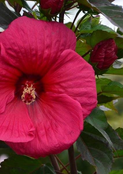 Vivace arbustive – Grandes fleurs rouge cerise – Feuillage pourpre